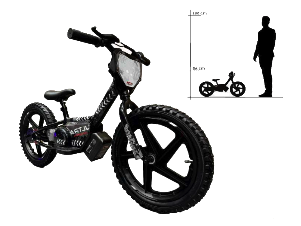 De fiets is uitgerust met een krachtige 24V Lithium accu die eenvoudig te verwijderen is, zodat je hem kunt opladen zonder de fiets zelf te verplaatsen. De accu voedt een 24V 180 watt motor die het rijden gemakkelijk en plezierig maakt. De motor biedt twee snelheidsinstellingen: 10 km/h voor rustig oefenen en 18 km/h voor meer snelheid en avontuur. Dit maakt de bike geschikt voor zowel beginnende als meer ervaren jonge rijders.