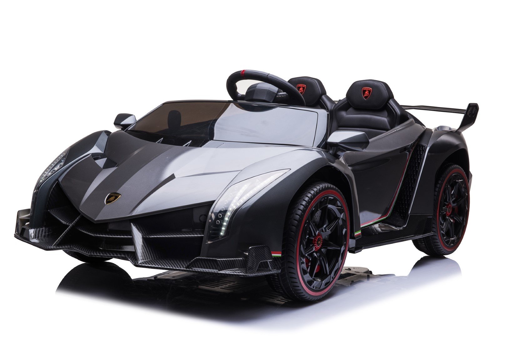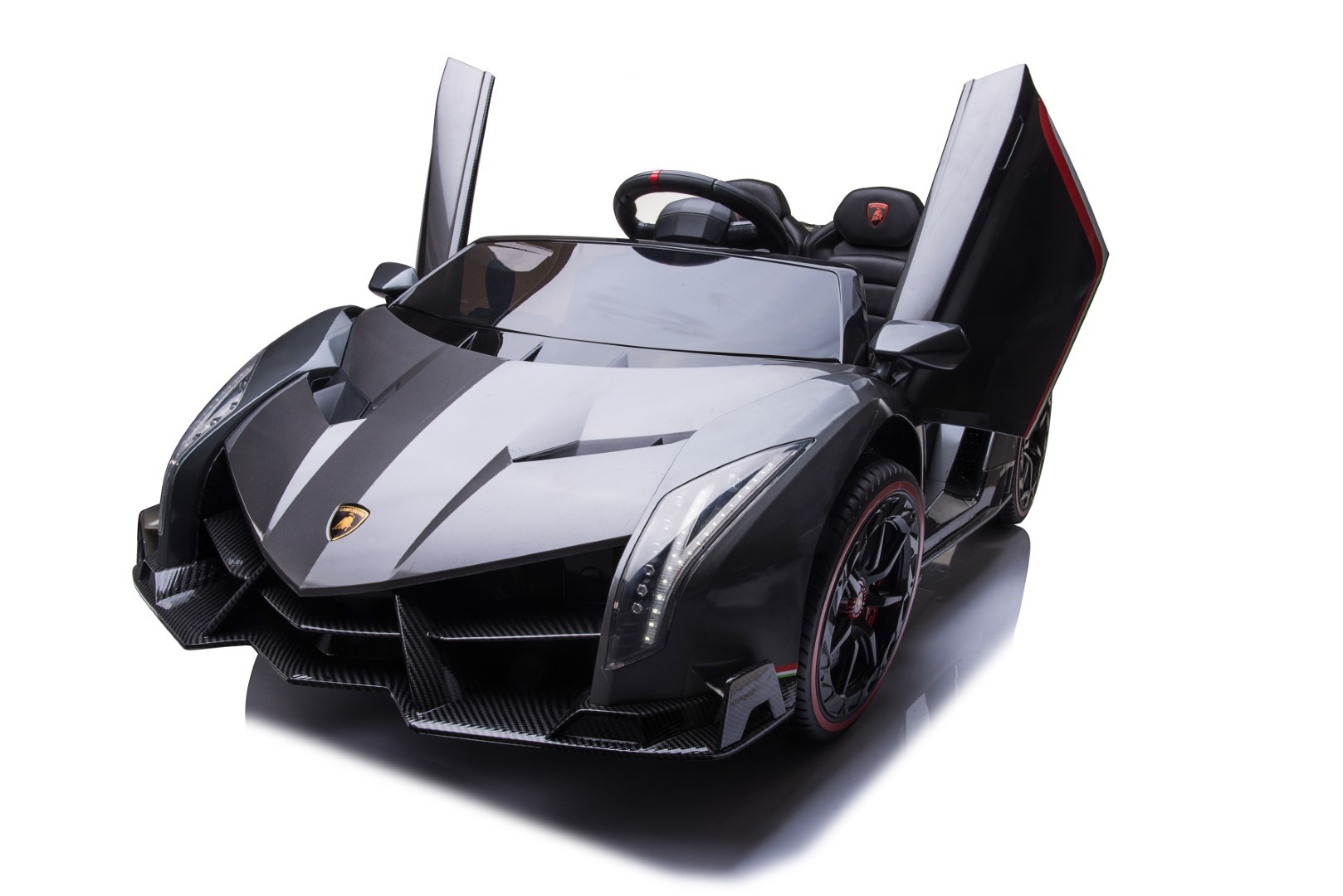 De LAMBORGHINI VENENO is uiterst sportief en uiterst stoer. De prachtige kinderauto is een replica van de echte Veneno en is geproduceerd onder licentie van Lamborghini. Deze 2-zitter is voorzien van 4 krachtige 45 watt motoren, dus alle wielen worden aangedreven. De snelheid is verstelbaar vanaf 2 tot 8 km per uur. Verder Lamborghini accu voertuig uitgevoerd met veel opties als: hoogglanslak, 2 echte Lambo deuren, volledig rubberen banden, lederzitje, geveerde wielen, ledverlichting, toeter, muziek, MP3- en USB-aansluiting om eigen muziek af te spelen. Met de “soft start” functie voelen kinderen geen schokje bij het optrekken.